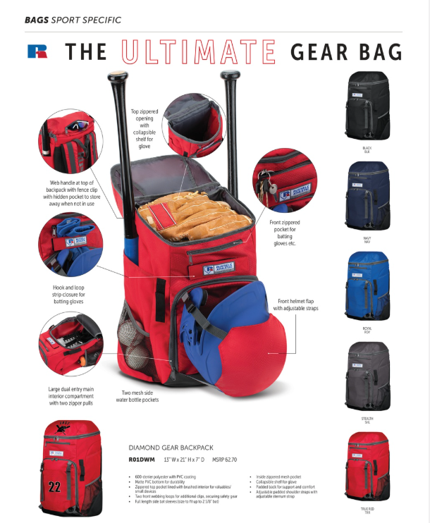 - Front zippered pocket for batting gloves etc.